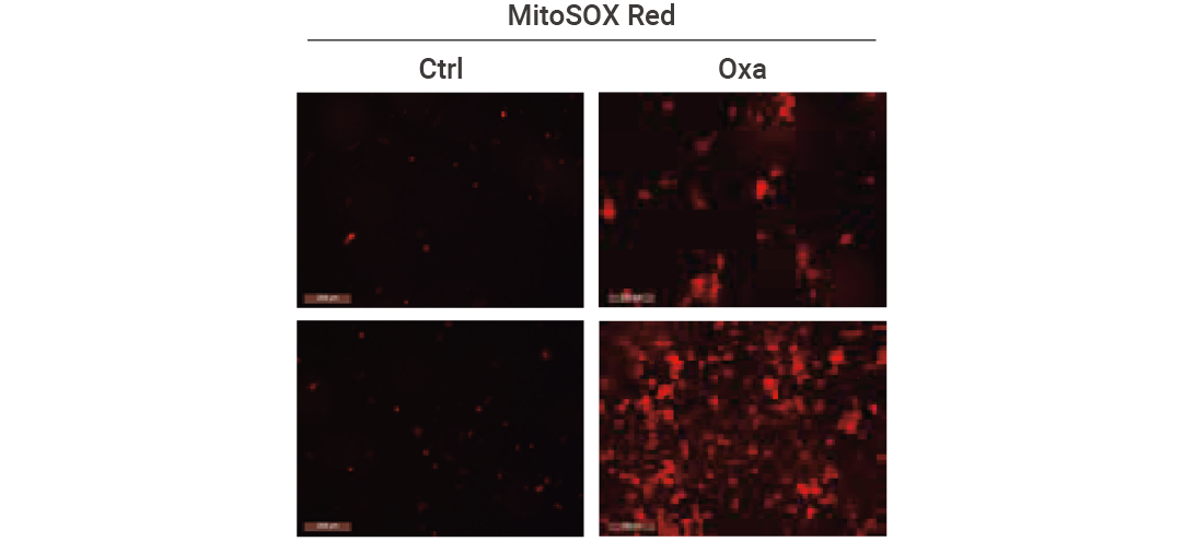 莫慌, MitoSOX Red (HY-D1055) 就能够避免其他来源 ROS 的干扰,直接反映线粒体的超氧化物生成状态。MitoSOX Red 可以穿透细胞膜,通过线粒体膜电位依赖性的方式积聚在线粒体中,并被其中的超氧化物氧化,氧化产物与线粒体核酸结合发出强烈荧光 (Ex/Em=510/580 nm)[15][16]。
