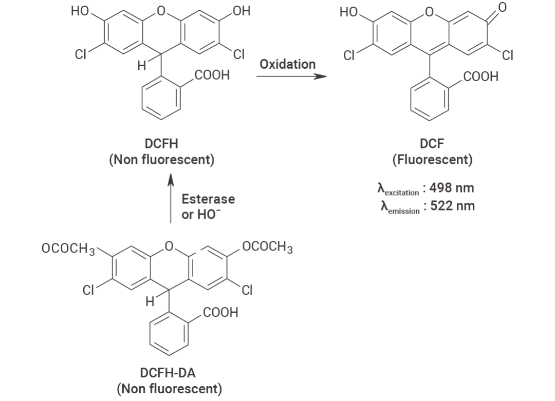 如图 5 所示,DCFH 氧化生成 DCF,一种荧光化合物,最初被认为是检测H2O2 的特定指示剂。然而,已经证明 DCFH 可以被其他 ROS 氧化。DCFH-DA (DCFH二乙酸形式, H2DCFH-DA, HY-D0940) 可以应用于细胞研究,因为它能够通过细胞膜扩散,然后被细胞内酯酶酶解成 DCFH。随后,被多种 ROS 氧化 的 DCFH 生成绿色荧光的 DCF,被广泛应用于总 ROS 的检测[1][11][12]。