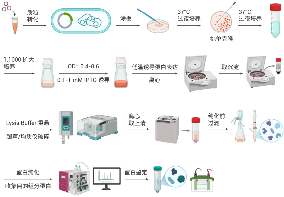 图 1. 蛋白表达、纯化、检测流程示意图 (以大肠杆菌为例)。