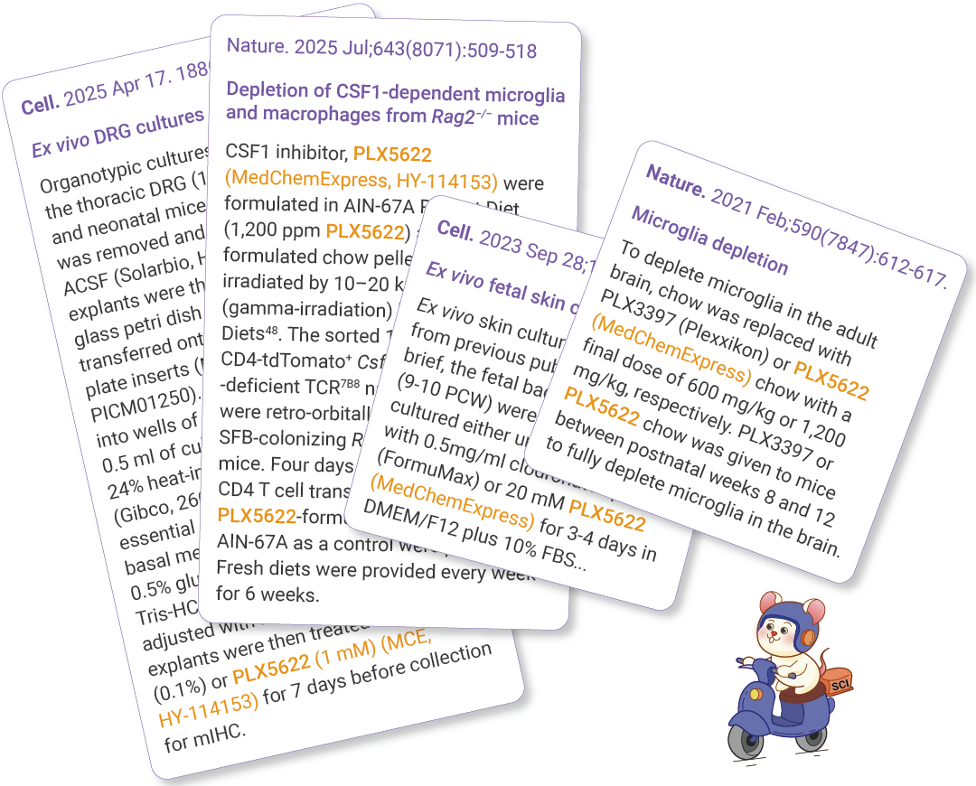[16] Mohamed SH, et al. CSF1R inhibition by PLX5622 reduces pulmonary fungal infection by depleting MHCIIhi interstitial lung macrophages. Mucosal Immunol. 2024 Dec;17(6):1256-1272.