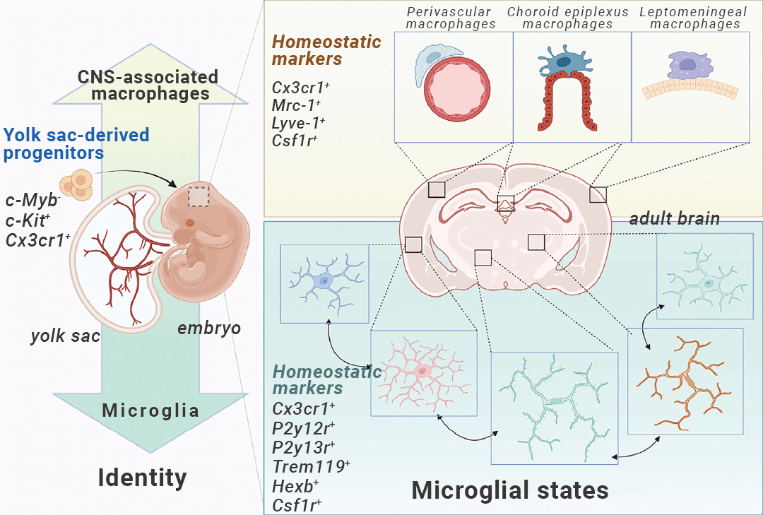 与血管周围间隙、脉络丛和软脑膜中的其他中枢神经系统相关巨噬细胞相比,小胶质细胞的身份在早期就由卵黄囊来源的祖细胞确定。一旦它们在脑实质中定植并分化,它们就可以根据特定的时空环境呈现多种状态。