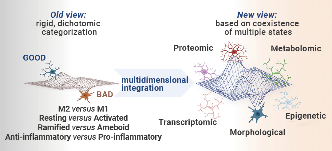 然而,很快发现巨噬细胞的反应比简单的“M1”和“M2”更复杂 (图 2)。就小胶质细胞而言,单细胞技术的出现提供了明确的证据,表明活体脑中的小胶质细胞不会极化为这两种类别中的任何一种,通常同时表达 M1 和 M2 标记物。可以从表观遗传学、转录组学、代谢组学和蛋白质组学数据等多个维度整合小胶质细胞的共存状态[2]。