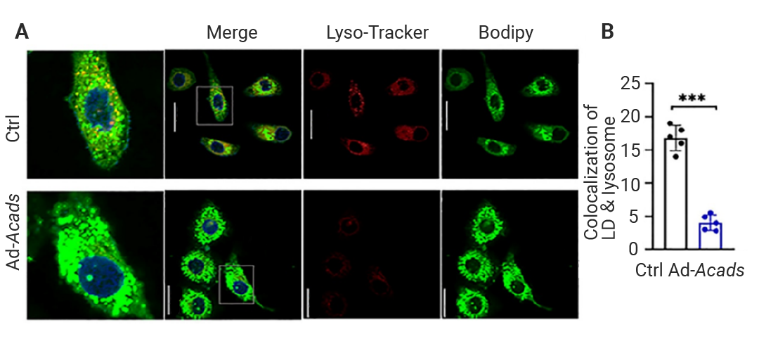 下面让我们来看一例 MCE 产品标记细胞器的文献实操。Su 等人报道了短链酰基-COA 脱氢酶 (short-chain acyl-CoA dehydrogenase, SCAD) 通过乙酰辅酶 A 依赖的脂噬通路加速衰老相关的肝脏脂肪变性,文中使用 BODIPY 493/503 (HY‐W090090) 和 LysoTracker Red (HY‐D1300) 分别对 HepG2 细胞中的脂滴和溶酶体进行标记和共定位分析。