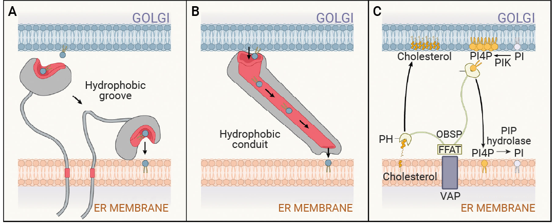 LTP 家族结构多样,但其作用机制大致可分为两类:脂质穿梭转运蛋白和形成脂质通道的蛋白。大多数穿梭转运蛋白在一个疏水裂隙或沟槽中结合单个脂质单体。在某些情况下,结合的脂质还被一个盖结构域屏蔽,使其与水相隔绝。这些 LTP 可以从膜中提取脂质,将其转运穿过水相,并递送到另一膜 (图 3A)。许多 LTP 还具有辅助结构域,使其定位到接触位点。