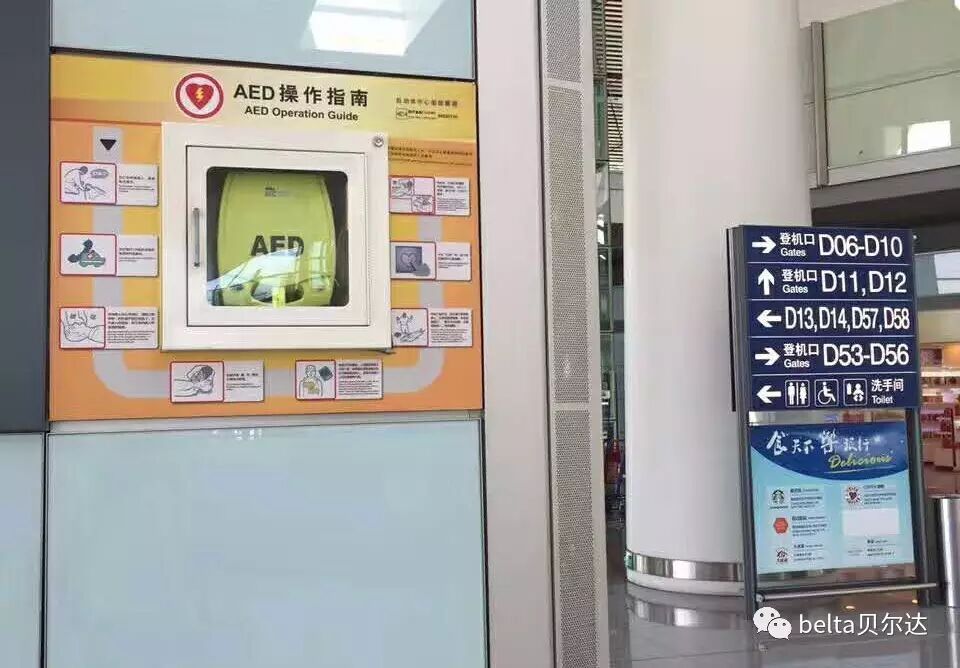 首都机场,2016年累计客流量9000万人次,据了解,这里是北京配置AED最集中的地方,工作人员表示,整个机场各个显著位置都有AED;