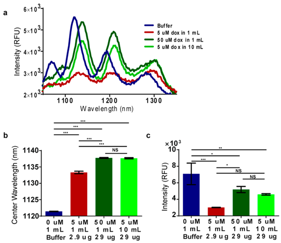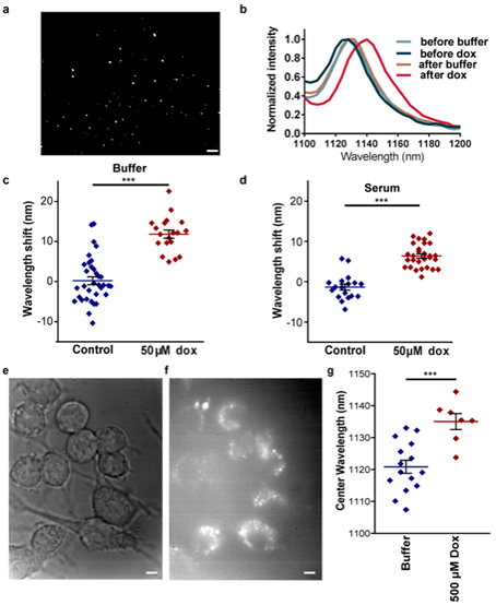 Dox或仅缓冲液处理时的波长偏移。每个点代表单个纳米管。中心线为平均值。(d)全血清中,缓冲液或50μM