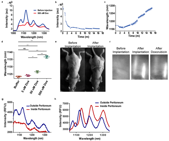 图4 多柔比星的检测为累积式。(a)不同孵育情况下可植入膜装置中DNA悬浮纳米管的发射光谱。(b)(9,4)中心波长。(c)a和b中数据的强度。 06-体内植入纳米传感器的功能性评估 通过手术将装载纳米管的膜植入活小鼠腹膜腔。动物苏醒并能行走1h后,异氟醚再次麻醉。用定制的激光探针装置透过皮肤测量植入的碳纳米管荧光,装置由730nm激光器和耦合InGaAs阵列检测器的光谱仪组成。测量后,腹膜内给药1mL/500μM多柔比星,再次允许小鼠苏醒并走动。30min后,麻醉测量纳米管荧光。发现注射多柔比星产生了预期的红移和强度猝灭(图5a)。 连续测量以评估注射后立即结合的多柔比星的动力学。重复之前的植入和多柔比星给药实验,同时在多柔比星注射前后连续监测(8,6)纳米管,数据采集时间0.5s。观察到最初的猝灭(图5b),随后约4min时出现红移(图5c)。未发现皮肤损伤、痛苦迹象等实验损伤。 体内检测阈值方面,腹腔注射缓冲液、5μM、50μM或500μM多柔比星。发现(9,4)手性在50μM和500μM浓度下都有显著红移,但5μM浓度下没有(图5d),(8,6)手性中也有类似变化。检测到50μM多柔比星,而不是5μM,与全血清中数据一致。 最后研究了植入碳纳米管传感器是否可实现区室特异性测量。通过手术将两个碳纳米管装置分别放置于腹膜腔中、皮肤与腹膜间。定制的全动物近红外临床前高光谱成像仪评估放置情况,皮肤下可见一个植入装置(图5e)。730nm宽带近红外成像显示两个植入物的纳米管发光。腹腔注射多柔比星,监测植入装置荧光强度(图5f)。宽带成像显示腹膜腔中发生淬灭,但皮下没有(图5f)。收集全动物高光谱数据,皮下植入物注射前后光谱完全相似,腹膜植入物因发光强度过低无法辨别。使用光纤探针连接的近红外光谱仪体内测量发现,与腹膜外的装置相比,腹膜内的装置发生了很大程度红移及淬灭(图5g)。离体测量实验证实了体内观察到的红移(图5h)。两种传感器的应答差异表明,本实验条件下多柔比星主要局限于腹膜内。
