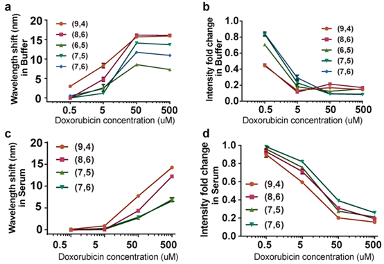 图1 DNA嵌入剂与DNA包裹纳米管的相互作用。(a)5种DNA嵌入剂的结构。(b)添加1μM化合物后DNA包裹纳米管的发光谱。(c)加入1μM化合物后,三个手性的波长相对于缓冲液对照组的偏移。(d)加入1μM化合物后三种手性强度相对于对照的倍数变化。 02-DNA-纳米管对多柔比星应答的量化分析 稀释实验发现,多柔比星浓度500nM-50μM,孵育4h后,大多数纳米管手性表现出剂量依赖性红移(图2a)。除(9,4)的500nm外,所有手性的检测限为5μM多柔比星。5μM多柔比星孵育可引发纳米管发光淬灭60-80%,0.5μM多柔比星可引发20-50%淬灭(图2b)。基于发光强度方面,所有手性的灵敏度可达500nm。引入多柔比星后,测量纳米管发光应答的动力学。波长偏移和强度猝灭应答很快,大部分发生于样品添加和首次测量之间。 已知由于与血清蛋白的静电相互作用,碳纳米管发光会出现非特异性红移。因此探究在复杂生物溶液如血清中定量检测多柔比星的可能性。剂量反应实验观察到剂量依赖性红移(图2c)及强度猝灭(图2d),与仅使用缓冲液情况相比,灵敏度降低了约1个数量级:除(9,4)(5μM)外的所有手性在50μM发生波长偏移,强度变化发生在5μM。鉴于多柔比星可与血清蛋白结合,可能因此降低了游离药物与纳米管传感器的结合。