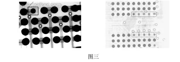 气泡现象在X光下的图像如图二所示。气泡主要是由焊锡膏里的助焊剂和湿气造成的,气泡的位置多出现在球底部,所以如果面积太大就会影响稳定性,出现锡裂,这也是虚焊的一种,所以气泡的面积百分比就成为一项重要指标。行业的标准及IPC都有明确指标,面积百分比不应该超过25%。很多使用者不知道在做气泡测量之前,必须加大X光管的功率来把锡球击穿,气泡的区域就会以白色呈现出来。冷焊是个很有趣的现象,它最明显的特征是球周边不圆,不管是从正面或侧面观察都是这样,如图三所示。