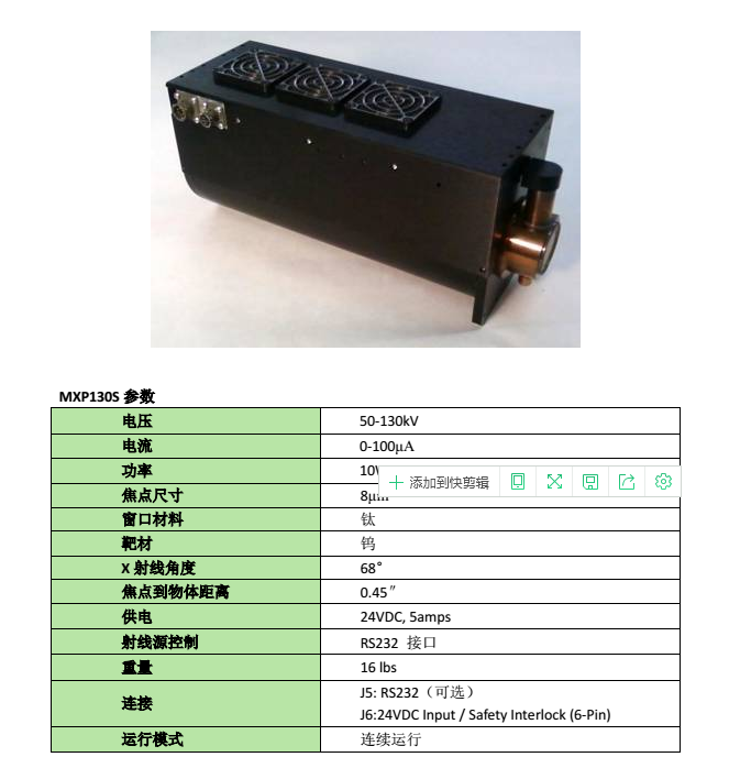 该产品内置高压电源和精密反馈电路,补给式阴极可提供均匀稳定的8μm焦点,没有过热点不会烧毁靶材,能连续工作而不会对射线管造成损坏,如需要高功率运行,还可定制为最高功率40W,最小焦点尺寸20μm。