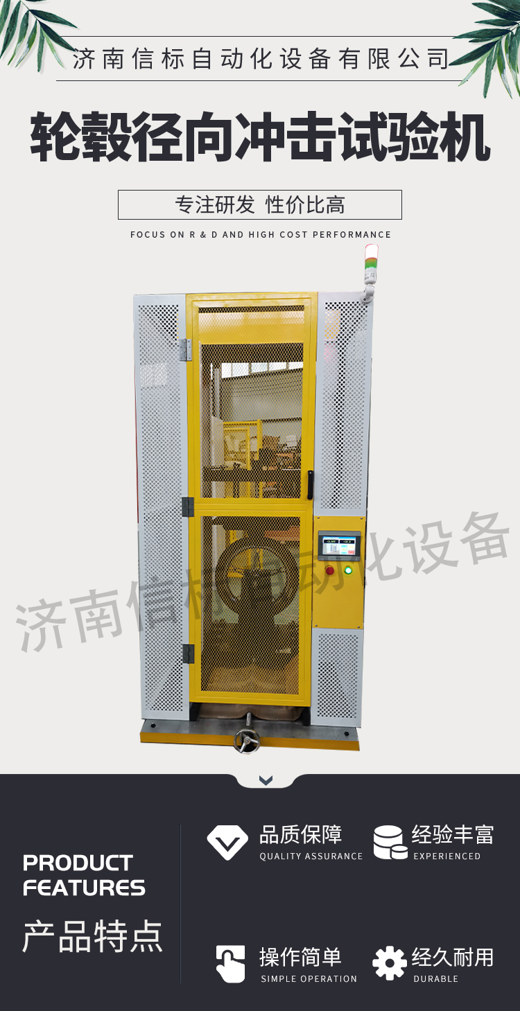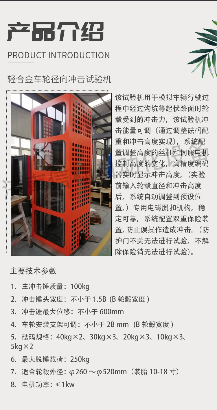该试验机用于模拟车辆行驶过程中经过沟坑等起伏路面时轮毂受到的冲击力,该试验机冲击能量可调(通过调整砝码配重和冲击高度实现),系统配置调整高度的丝杠和伺服电机控制高度的变化,高精度编码器实时显示冲击高度,(实验前输入轮毂直径和冲击高度后,系统自动调整到预设位置,)专用电磁脱扣机构,稳定可靠,系统配置双重保险装置,防止误操作造成冲击。(防护门不关无法进行试验,不解除保险销无法进行试验)。