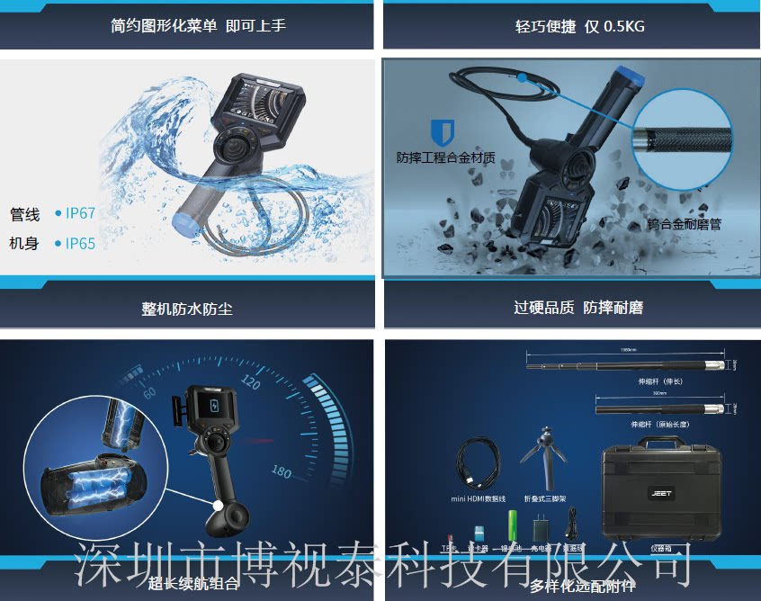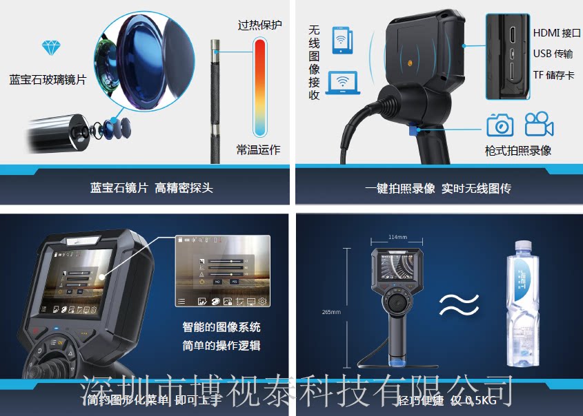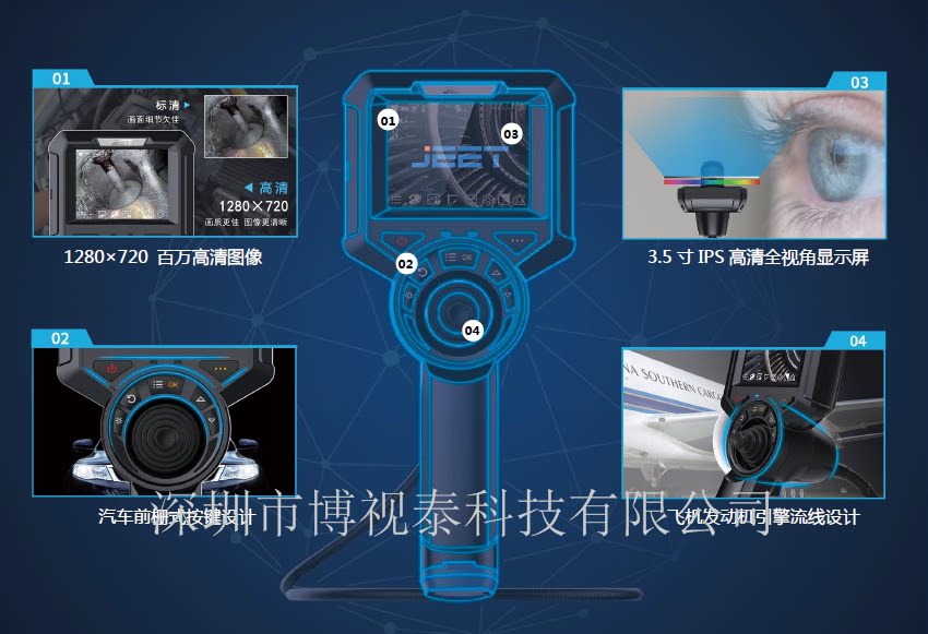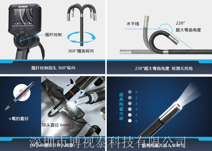 工业视频内窥镜,是无损检测的一个分支,也是一门专用的检测技术。适用于高温、有毒、核辐射及人眼无法直接观察到的场所的检查和观察(如:汽车装配、汽车铸造、发动机、管道、机械零件、压力容器、电力系统、风力发电、化学、机械设备、铁路机车等)、可在不需拆卸或破坏组装及设备停止运行的情况下实现无损检测,能大幅度提高检测效率与设备的性能。