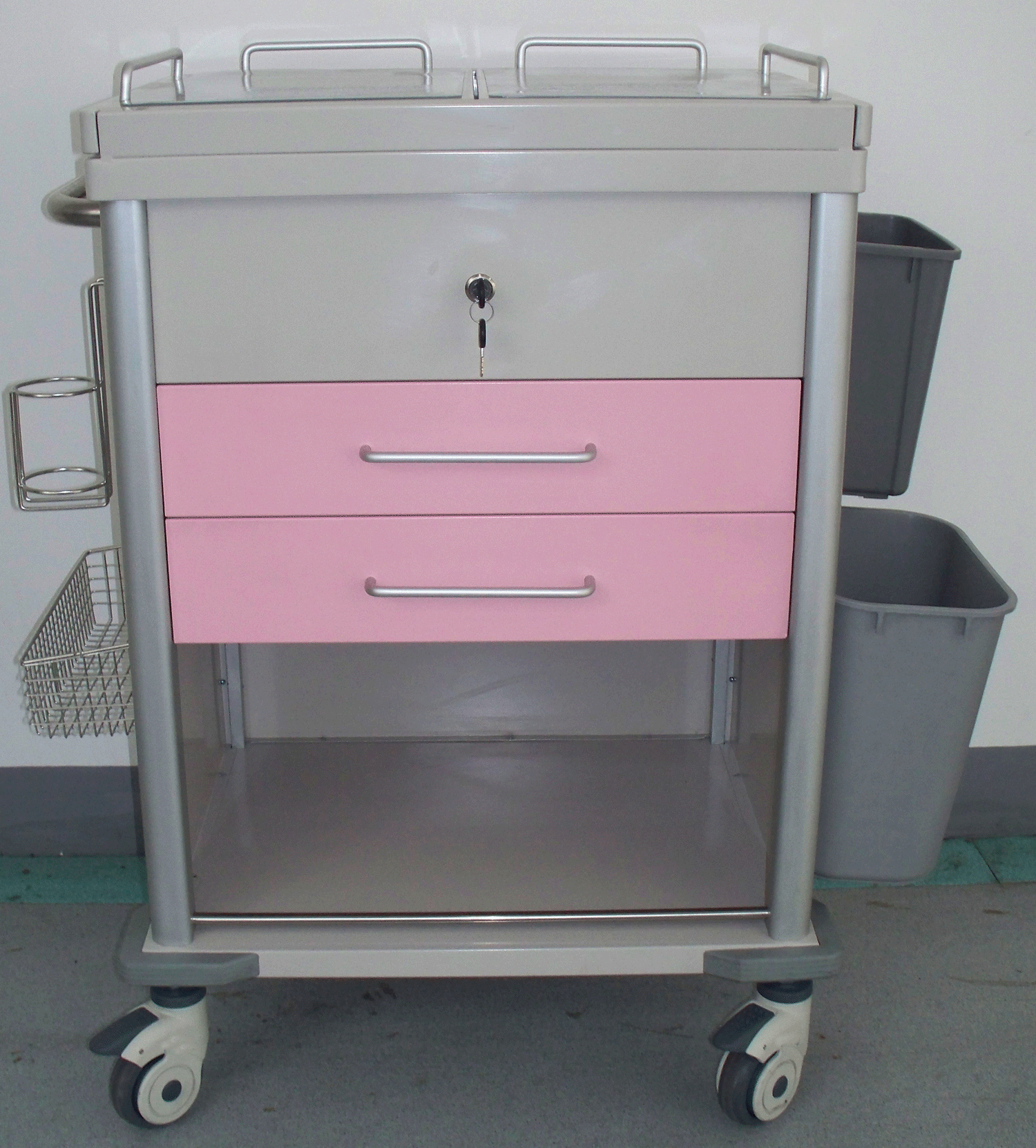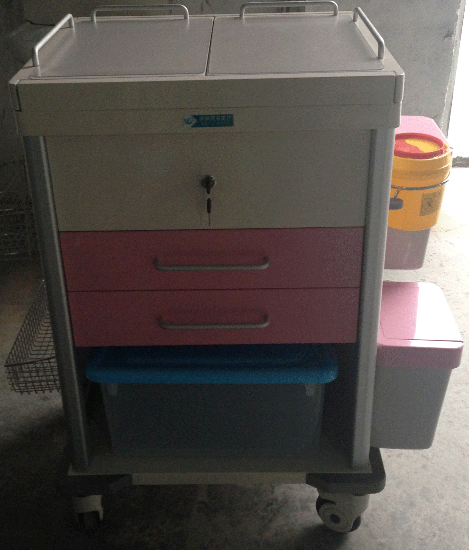 左侧上方后面1只病历夹挂篮、前面1只3M洗手液挂架、下方1只斜口挂篮。