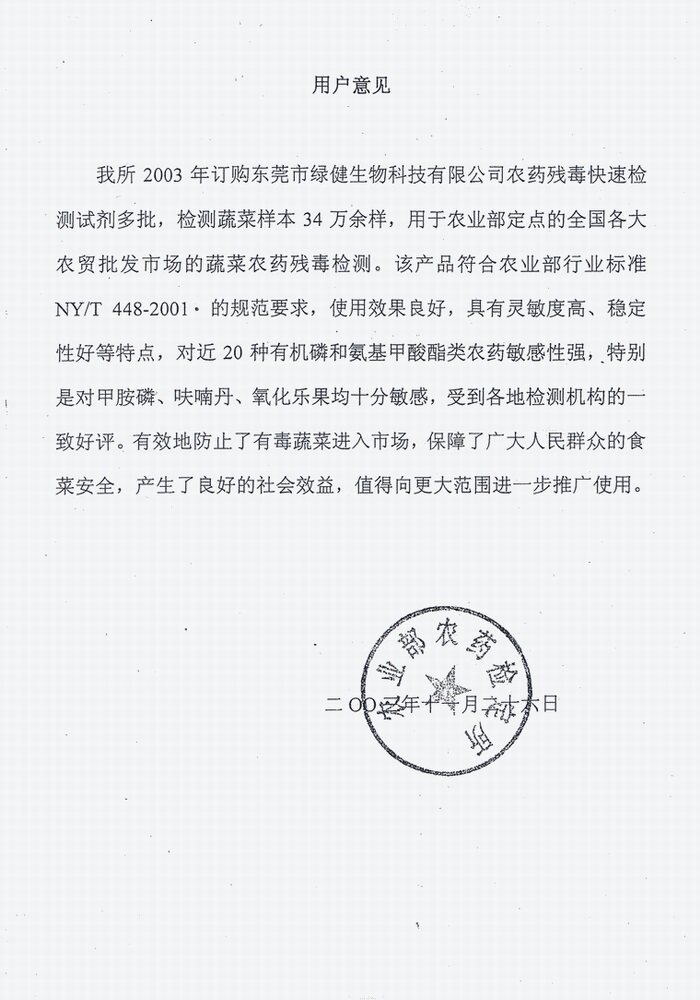 【产品规格】20片/盒 【预期用途】农药速测卡是用对农药高度敏感的胆碱酯酶和显色剂做成的酶试纸,可以快速检测蔬菜中有机磷和氨基甲酸酯这两大类用量较大、毒性较高的杀虫剂的残留情况,选用的酶对甲胺磷敏感,抗干扰性强,操作简便,不需要配制试剂,不需要专业的技术培训,产品容易贮存,携带方便,是现场检测的最佳方法。 【产品说明】农药速测卡是用对农药高度敏感的胆碱酯酶和显色剂做成的酶试纸,可以快速检测蔬菜中有机磷和氨基甲酸酯这两大类用量较大、毒性较高的杀虫剂的残留情况,选用的酶对甲胺磷敏感,抗干扰性强,操作简便,不需要配制试剂,不需要专业的技术培训,可以不需要任何仪器设备单独使用,产品容易贮存,携带方便,是现场检测的最佳方法。 目前,广州、深圳、珠海、惠州、香港、重庆、厦门、青岛、南宁、西安、郑州、石家庄、合肥、宁波和柳州等城市都已把农药速测卡作为常规的检测方法。如用本品先对大量的样品进行初筛,然后才用仪器法对少量阳性样品进行定量分析,就可以大大的提高工作效率,节省大量人力物力。本产品已经过多个技术权威部门的质量认定:卫生部食品卫生监督检验所、北京市产品质量监督检验所、香港政府化验所、香港卫生署、广东省食品卫生监督检验所、广东省出入境检验检疫局、广东省农药检定所、华南农业大学昆虫毒理研究室、深圳市卫生防疫站、深圳出入境检验检疫局和深圳农科中心等。并且荣获九四年广东省优秀新产品奖、九五年深圳市科技进步三等奖、 2000年广东省出入境检验检疫局科技成果一等奖、国家出入境检验检疫局科技兴检三等奖和广东省科技进步三等奖。农药速测卡快速检验方法已经国家标准委员会通过,定为国家标准方法GB/T5009.199-2003。对食物残留农药的检测卡片已申请专利,专利号为:ZL03226093.8。 农药速测卡对几种常用农药的最低检测限(单位 mg/kg)如下: 甲胺磷 1.7 马拉硫磷 2.0 水胺硫磷 3.1 对硫磷 1.7 氧化乐果 2.3 久效磷 2.5 好年冬 1.0 敌敌畏 0.3 乐果 1.3 敌百虫 0.3 呋喃丹 0.5 西维因 2.5 乙酰甲胺磷 3.5 以上是由卫生部食品卫生监督检验所和北京市产品质量监督检验所等七个单位用气相色谱法对比试验和验证数据的统计表。 【使用方法】 一、整体测定法 - 选取有代表性的蔬菜样品,擦去表面泥土,剪成1cm左右见方碎片,取5g放入带盖瓶中,加入10mL纯净水或缓冲溶液,震摇50次,静置2min以上。