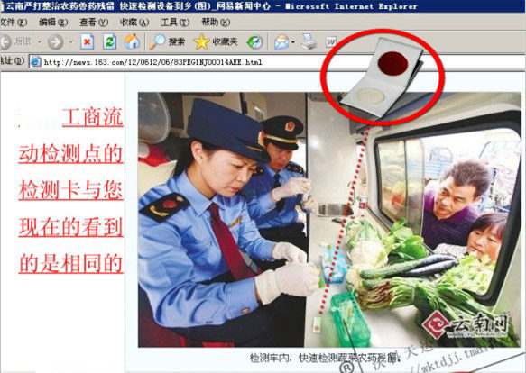 - 取一片速测卡,撕去上盖膜,将蔬菜上的液滴滴在白色药片上。