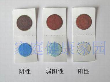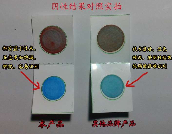 - 红色药片与白色药片叠合反应的时间以3min为准,3min后蓝色会逐渐加深,24h后颜色会逐渐褪去。