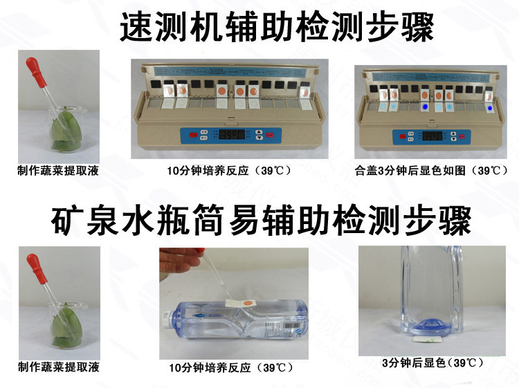 【注意事项】 - 葱、蒜、萝卜、韭菜、芹菜、香菜、茭白、蘑菇及番茄汁液中,含有对酶有影响的植物次生物质,容易产生假阳性。处理这类样品时,可采取整株(体)蔬菜浸提或采用表面测定法。对一些含叶绿素较高的蔬菜,也可采取整株(体)蔬菜浸提的方法,减少色素的干扰。