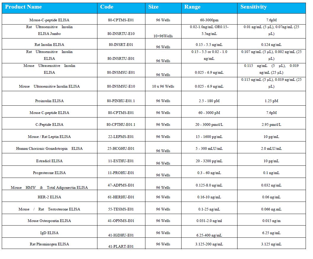 等,为您的科研提供了完备的检测手段。ALPCO 试剂盒对于检测范围、检测灵敏度、样品体积和孵育时间都