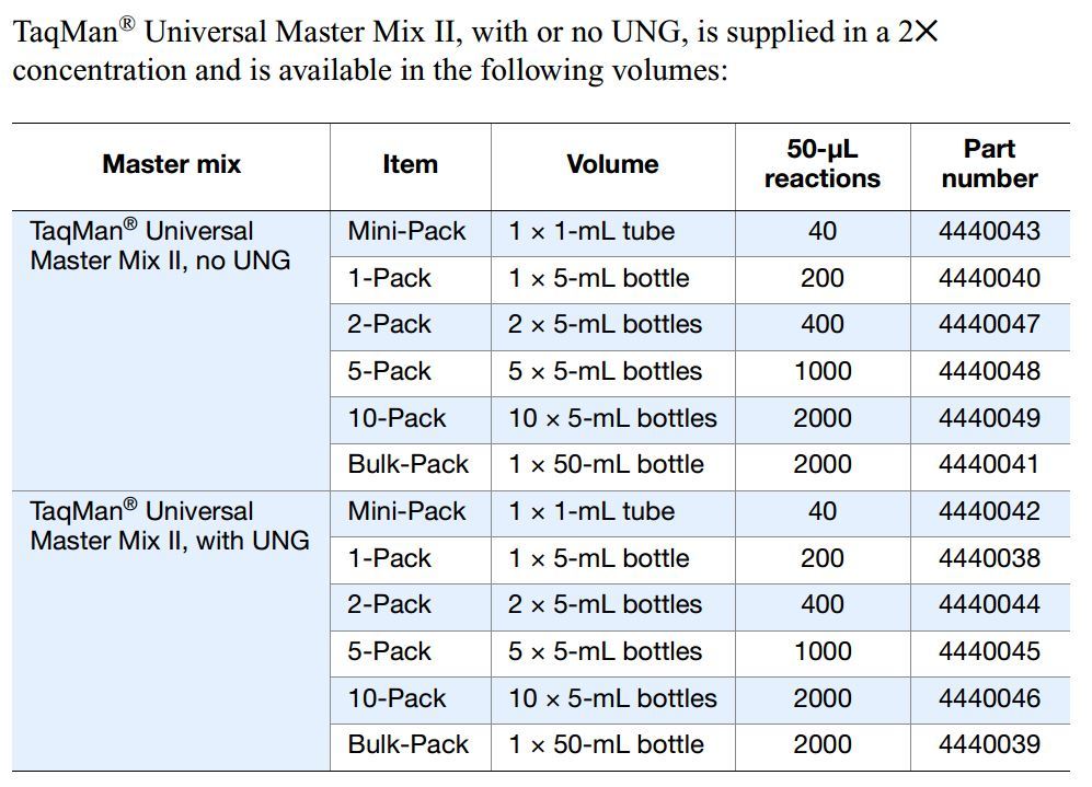 4440042 | TaqMan Universal Master Mix II, with UNG Mini-Pack (1x1mL) | 1122 | 726 |