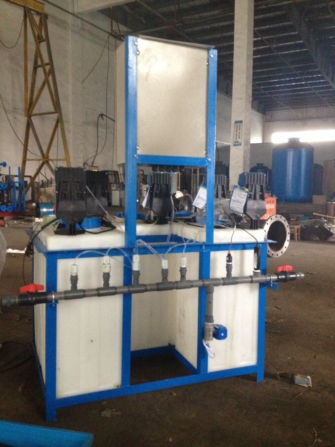 全自动加药装置的详细描述: 产品介绍: 中央空调/工业循环冷却水系统都将面临腐蚀、结垢和生物粘泥附着三大隐患,导致传热效率降低、能耗增加,设备锈蚀、管道堵塞或渗漏等一系列故障隐患,缩短设备寿命周期。目前,消除上述隐患的办法有多种,如臭氧法、超低频振动法以及化学净化法(投加阻垢剂、缓蚀剂和杀菌-灭藻剂)。后者最为常用,一次性设备投入较低,但对药剂的投加有一定要求,如适量、均匀、连续或定时,否则可能达不到预期效果,或增加运行费用。实践表明:采用自动加药技术及成套设备是提高设备效率、延长使用寿命、减少运行费用、强化管理工作的有效手段。 工作原理:从系统供回水主管道上分别连接小管道至自动加药装置,形成一个循环管路。装置通过高精度在线水质检测设备,跟踪循环水质变化,并控制加药泵自动实时定量向水中添加药剂,达到相对应的水处理效果。同时,装置检测循环冷却水的浓缩倍数,实现定量自动排污,确保冷却水的浓缩倍数处于经济合理的范围内,以充分发挥药剂作用,节约排污水量。 菲洛克自动加药装置组成:(一) 定量自动加药装置用途:定量投加阻垢剂、缓蚀剂、杀菌灭藻剂。配置:(1) 计量泵SECO(意大利原装进口),(也可根据用户需要选择其他品牌计量泵)。流量:1.0~20L/hr,压力0.1/0.5/0.6/0.8/1.0Mpa; 加药速率可连续设定。(2) 药箱PE,60-200L(容积可扩大至500L),附液位下限开关;(3) 定量注水-配药系统(选项)根据浓缩药液或粉剂数量设定注水量,自动注水配置药液;(4) 搅拌机(选项)交流单相电容电机220V/50Hz;不锈钢轴、PVC或不锈钢叶轮;根据补水流量信号按比例加药。(二)浓缩倍数保持系统用途:在线监测循环水电导率,连续显示水体中可溶性物质浓度变化情况。当电导率到达上限设定值(与最适浓缩倍数对应)时自动开启排污电磁阀;当电导率回复到下限设定值时关闭电磁阀,停止排污。配置:(1) 在线式电导率检测仪1套(传感器安装在工艺管道上或流动测量池中)(2) 补水流量计:电远传水表(DN80以下)或叶轮式流量传感器(DN80以上)(3) 排污阀:电磁阀(DN80以下)或电动阀(DN80以上)(三)控制箱用途:实现上述子系统自动化操作,包括:(1) 按补水流量比例控制2组或3组定量加药装置;自周一至周日每天设置3段时间定时加药。(2) 自动排污(3) 药箱液位底限报警、自动停泵(4) 搅拌机运行控制(选项)(5) 配药注水量控制(选项)(6) ‘手动-自动’操作转换配置:(1)可编程控制器LOGO-PLC(西门子)(2) 辅助电器 产品特点:? 以系统共设计为主体,克服了以单一设备或部件为设计主体的传统产品存在的系统性差的缺陷;? 吸取国外加药装置的精华,以全新的设计理念,使工艺更优化;? 产品结构模块化设计,一体化组合,可方便地进行能力和功能扩展;? 可根据不同的水质和用户的不同要求,灵活的配置最佳方案;? 国内外多种着名品牌、不同材质、各种档次的设备及部件,用户可任意选配;? 任选择手动、自动等多种控制方式,实现不同控制要求。应用范围: 产品分类:菲洛克循环冷却水自动加药系统主要包括两部分:其一,自动投加适量的阻垢剂、缓蚀剂和杀菌灭藻剂;其二,自动保持适宜的浓缩倍数或循环水电导率。1、FLK-A型功能:① 加药泵可工作在手动/自动两种运行模式。运行在“自动”模式时,由可编程时间控制器设定加药泵每天的运行时间段;运行在“手动”模式时,由操作人员按启动/停止按钮;② 加药泵为半自动操作计量泵。设定加药速度后即自行以恒定速率加药;③ 药箱内药剂液位低达下限时,自动停泵和发出声光报警信号。2、FLK-B型功能:有些用户要求带有搅拌机,故在FLK-A型基础上增加搅拌机及其控制器。3、FLK-C型功能:药液多为浓缩型或粉剂,必须注入适当水量稀释或溶解粉剂。配置同FLK-B型,增加配药用远传水表、注水电磁阀和控制电器。加入浓缩药液或粉剂后,按照设定的水流量值自动注入自来水,直至达到设定值时停止注水;与此同时自动开动搅拌机工作。4、FLK-D型 功能:① 在线监测循环水体的电导率,间接反映“浓缩倍数”(循环电导率/补充水电导率)。当电导率达到上限值时,自动开启排污阀和充水阀;当电导率恢复到下限设定值时,自动关闭排污阀和补充水阀。② 其他功能同FLK-B型。5、FLK-E型(集中操作型,PLC控制)适用于多套空调机组集中控制,控制柜操作盘上印有模拟控制流程图.根据用户实际需求可增加测量补充水电导率仪1台,冷却塔进、出口温度变送器各1台,集水池液位计1台以及pH计、浊度计、余氯分析仪等。设计造型说明:(1)化学加药设计依据:◆冷却水系统容易结垢、磁生微生物及腐蚀,冷冻水系统主要控制腐蚀、结垢及少量微生物。采用人工加药方法投药为间断性、冲击性投加,投加精确度也不够,无法直接根据系统参数精确计算需投加量,因此因安装带在线控制仪的全自动智能控制加药设备。◆各指标控制在正常范围内时,水质处于最佳状态,对管线的腐蚀、结垢控制在最低限,对管线起到良好的保护作用,延长管线使用寿命。可与自控VA系统连接,实现计算机远程控制,实现信息管理,对日后运转成本可大幅降低。(2)化学加药设计思路:◆药剂加药口位于系统动力泵吸口处,可保证系统加药的及时性,并确保水中指标符合规定指标。◆加药循环系统管线管道泵可保证在线检测数据的准确性,即在线检测数据能充分反映冷却水系水质状况