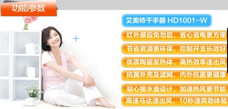商品信息HD1588毛重:3.1KG功率:1500W电源:220V-50HZ风速:15M/S防水等级:IP*1噪音值:65DB自动感应:是外形尺寸:261.4*274*195.8MM