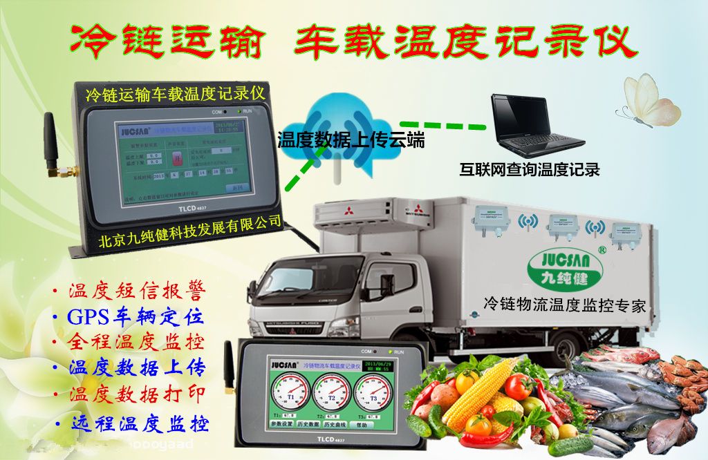 为了保证在药品、食品冷藏运输及配送环节实现温度监控,克服实时性差、监管脱节、取证和责任界定困难的不足,九纯健科技研发了一款可实现温度数据自动存储、车载触屏、实时GPRS数据传输,冷链温度车载触屏RTU,车截屏实现了在冷链车的驾驶室内就可以实时查看车厢内温度,并通过无线通讯和GPS定位功能(GPS定位功能为可选项),可将各个冷藏车内的监测温度和车辆位置实时传输到监控中心,通过配套的冷链车温度监测软件平台对各车进行统一管理。