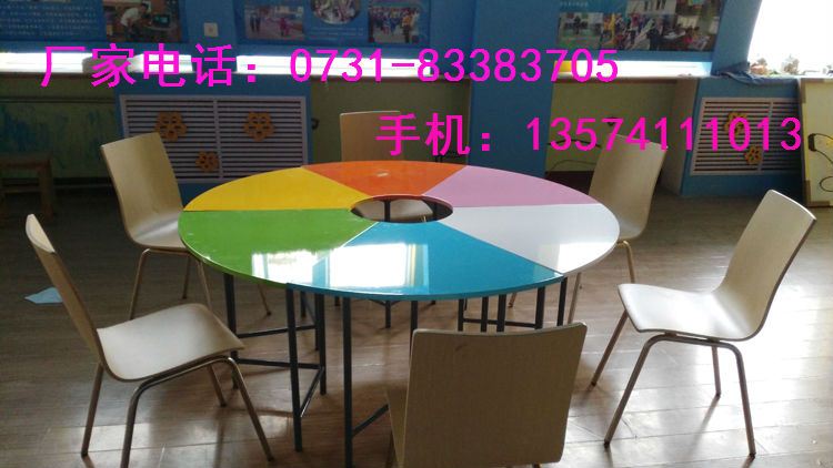 6色桌面,烤漆工艺,桌面支架采用直径2.5厘米圆管焊接而成,直径160厘米,高70厘米