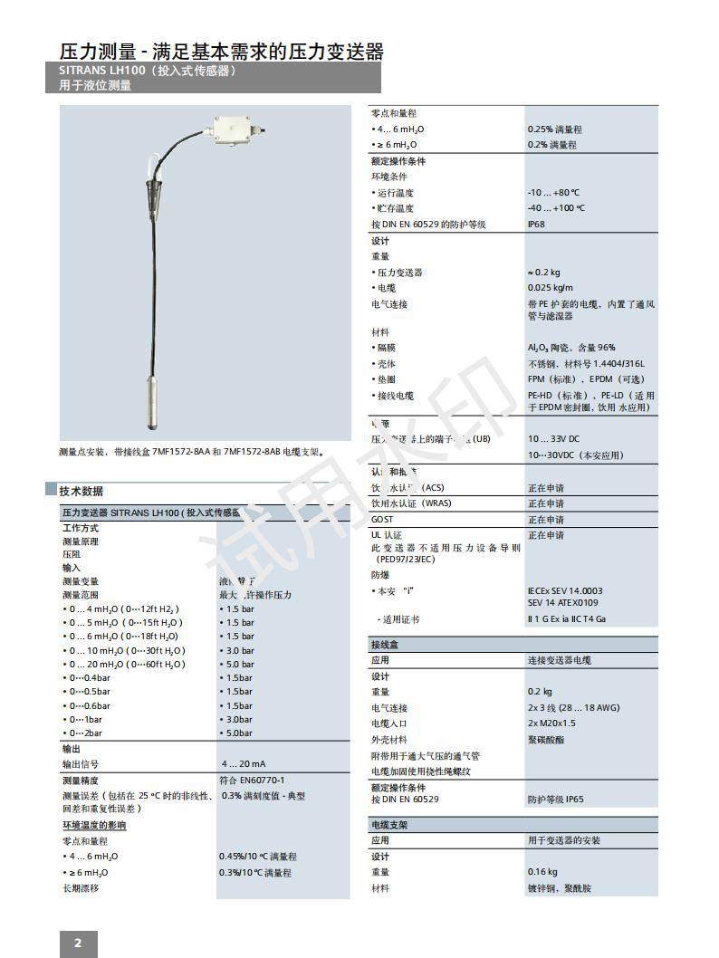 西门子投入式液位变送器7MF1572 液体静压液位测量传感器