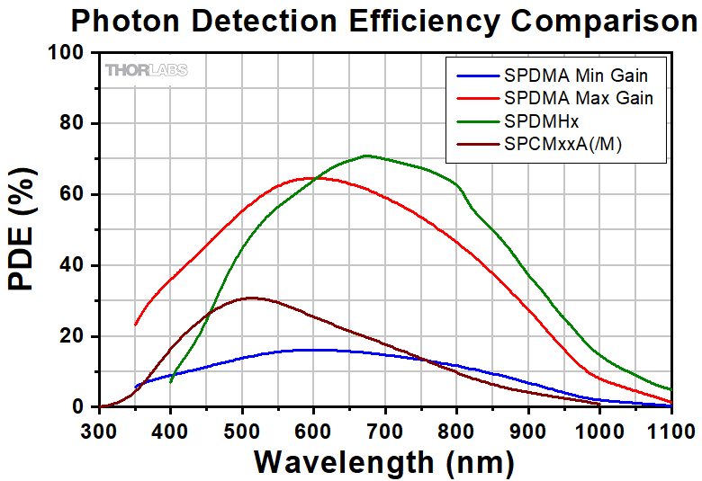 Thorlabs提供单光子探测或计数模块,这些模块具有一系列光子探测效率(PDE)、探测尺寸、增益选项和波长范围。SPDMA单光子探测模块设计用于350到1100 nm,具有连续可调增益和SMA电接头,通过SMA连接可在示波器或所连接的外部计数器中查看TTL输出。相比之下,SPDMHx固定增益单光子探测模块用于400到1000 nm,具有NIR范围内较高的PDE(见右图)和较低的 zui 大 暗计数率;输出TTL脉冲可通过LEMO接头读取。zui 后,SPCMxxA(/M)单光子计数模块包含内置31位光子计数器,并附带用于控制探测器和读取输出的软件包,适用于350到900 nm。下图比较了计数器的光子探测效率(PDE)。