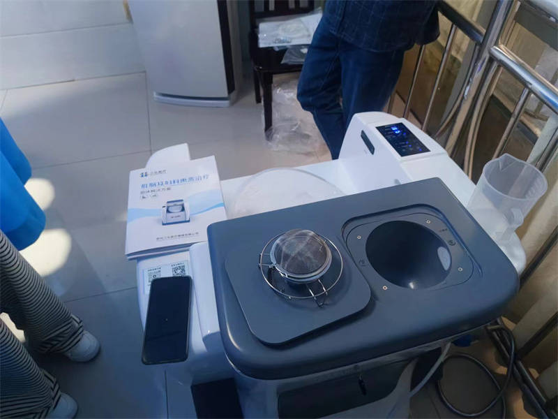 仪器由主机、排水软管,16A插头组成,在仪器安装前需要提前沟通好安装的位置,预留好16A的插座,和水龙头以及排水口。首先是接进水口,公司配备的有1.5米的软管连接水龙头。配备有两米的排水软管连接排水口。16A的插头连接插座。仪器安装好之后打开总开关。选择药液或者草药模式,我们以药液模式为例,选择坐温开或者关,把药液倒入进水口,点击加液按键,药液自动流入锅体内部,选择熏蒸时间和熏蒸温度,时间默认20分钟,温度默认28度,选择预热按键,等大概七八分钟,预热结束,点击治疗按键,仪器开始工作,在治疗过程中可点击冲洗功能对受伤部位进行冲洗,治疗完成后可点击清洁按键对锅体内部进行清洁。