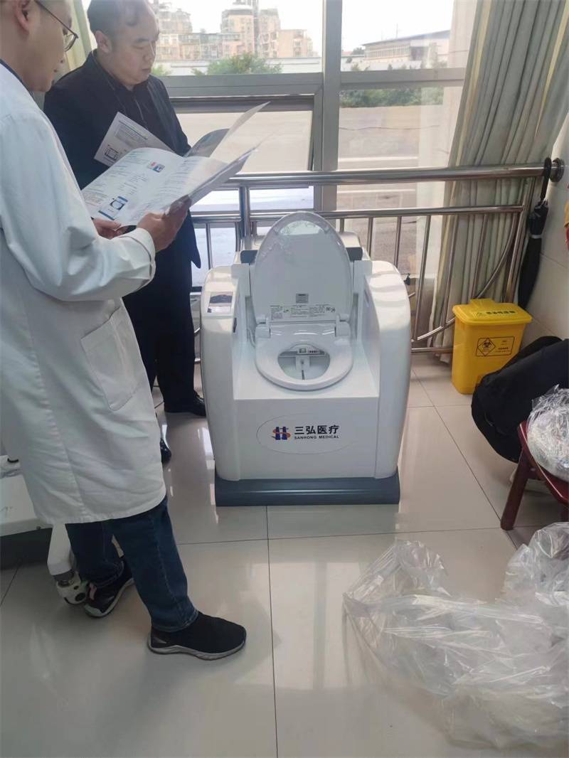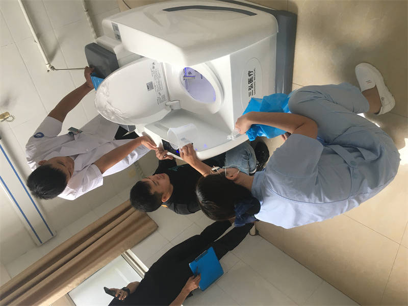 设备放在了二楼,是由厕所改装的空间,预留的是个三个位置,这次是先安装一台,另外两台后期再安装,仪器安装过程很顺利,有两个护士在一旁进行学习,仪器的整体操作比较简单,没有太复杂的东西,一般用的是药液,所以讲解的也是按照药液模式进行介绍,护士和相关领导对产品也非常满意。